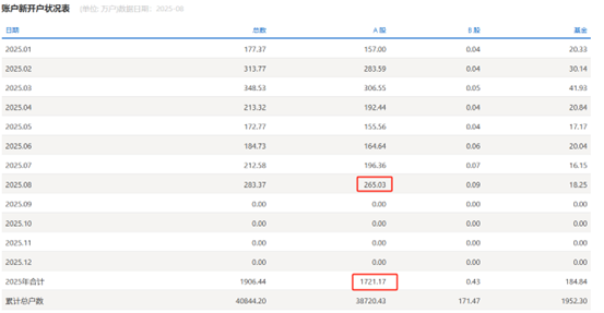 其中,8月新开户数265万户,仅次于今年2月和3月单月新开户数,且高于2024年全年10个月份单月的新开户数。